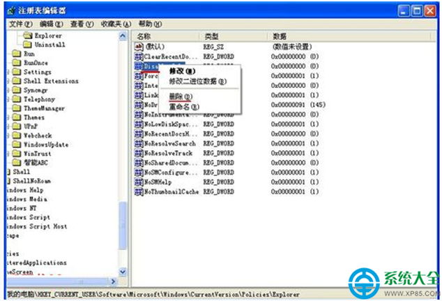 注册表路径:HKEY_CURRENT_USERSoftwareMicrosoftWindowsCurrentVersionPoliciesExplorer