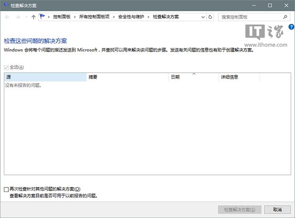 报告发送时会允许Win10通知用户是否有可用的解决方案。用户也可以手动检查已经存在的报告问题是否得到解决,具体方法如下: