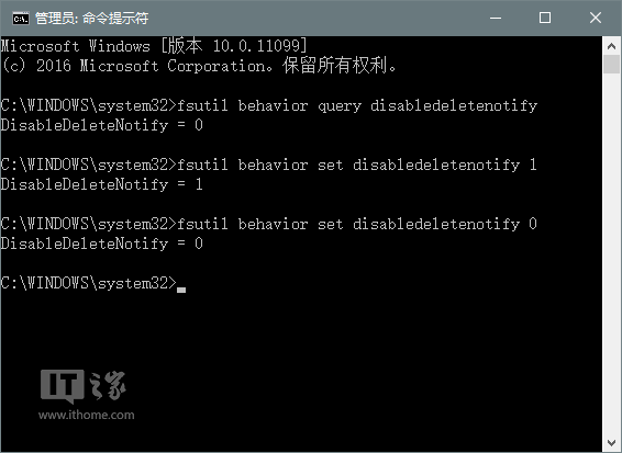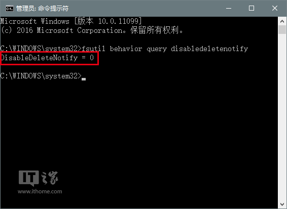 3、如果返回值为“0”证明TRIM已经开启;如果返回值是“1”,则说明当前电脑的SSD尚未开启TRIM。