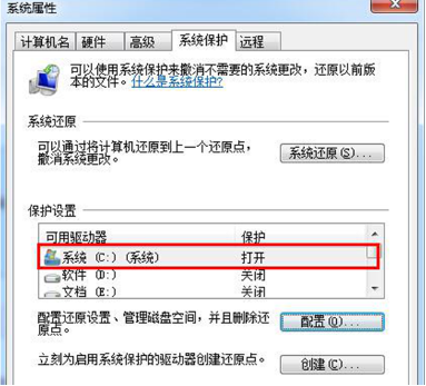 2、检查是否C盘没有开启系统保护原因,打开即可,具体操作是:在“计算机”图标上右击选择属性,点击左侧的系统保护,看看是否C盘开启了系统还原,如果没有的话,点击配置,然后在打开的配置窗口中,选择“还原系统配置和以前版本的文件”。