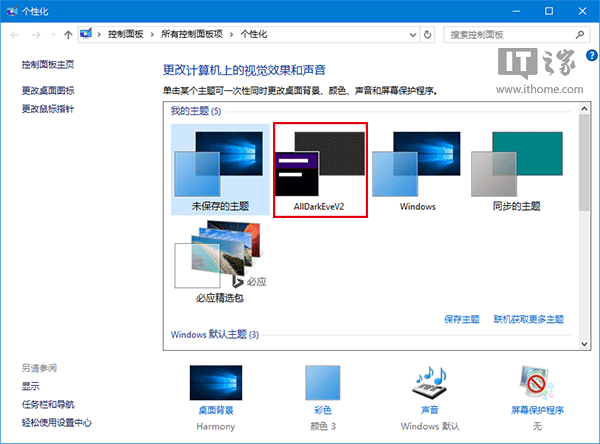 注意:该主题应用过程中,可能会出现停在“请稍候”界面,此时为“假死”,可按Ctrl+Alt+Del键调出控制界面,选择“锁定”,解锁后可回到系统,不影响刚才的程序。如果发现此时主题没有应用,在个性化→主题→主题设置中可以选择AllDarkEveV2来应用主题(如上图),此时应该不会出现“假死”状况。