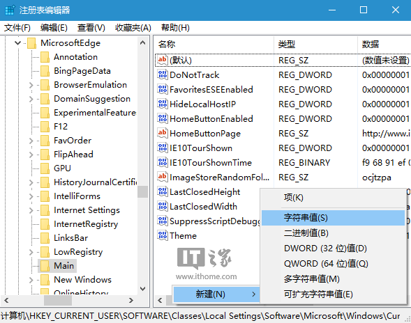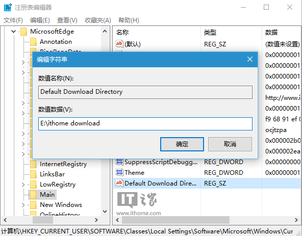 4、双击打开,在数值数据中输入你想设置的下载路径,比如E:ithome download(这个文件夹必须已经建立,否则无效),点击“确定”