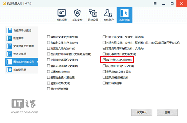 方法很简单,只要在设置大师→右键菜单→添加右键菜单项目中勾选“(反)注册DLL”就可以实现双向操作。同理,勾选“(反)注册OCX”也可以实现对OCX文件的注册操作。该方法同样适用于Windows7/Windows 8.1系统。