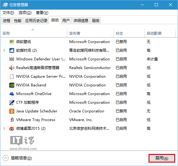 4、在任务管理器中点击“启动”选项卡,把所有第三方启动项全部禁用,如下图——