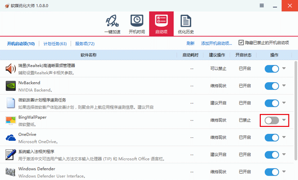 注意:上述步骤也可以在优化大师的“启动项”中统一完成,分别在“开机启动项”和“服务项”中进行关闭即可,点击右方的开关可直接关闭,无需点击“确定”等按钮。