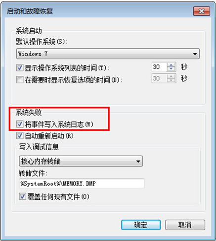 3、打开“启动和故障恢复”窗口.在“系统失败”栏中选中“将事件写入系统日志”窗口,然后依次单击“确定”按钮即可。