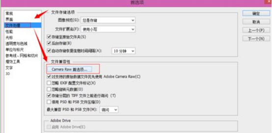 3、选择点击左侧的“文件处理”,在右侧中个点击文件兼容性下的“CameraRaw首选项”按钮。
