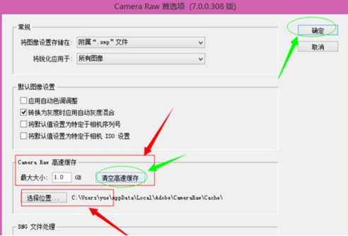 4、点击“清除高速缓存”清除缓存,如果在保存文件时出现"内存盘已满,没有足够内存"可先清除这里的缓存后再保存,我们可以把高速缓存大小设置大点,比如5个G,最后我们把缓存位置,如选择位置,选择非系统盘,如D盘,最后点确定即可。
