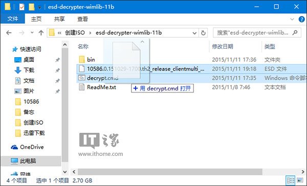 •拖动ESD映像文件到decrypt.cmd文件上即可,如下图: