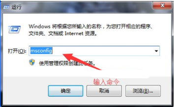 2、进入系统后,按“Win+R”组合键,打开“运行”窗口,输入“msconfig”命令后按回车键。