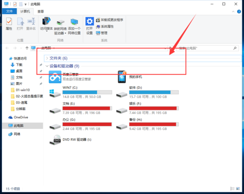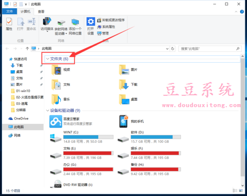 首先最简单的方法就是将win10此电脑文件夹进行隐藏,方法也是非常简单的,直接点击文件夹前面的三角号,就可以将这六个文件将全部折叠隐藏,这时候只会出现很细的一条线,并不会占用较大位置,先打开使用的话直接点击就可以展开,当然我们可以通过其他方法彻底删除这六个文件夹位置。