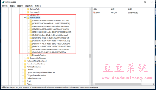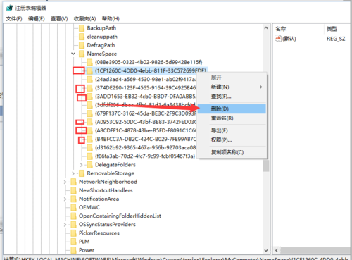 4、展开NameSpace文件后可以在下面看到很多文件夹,这个时候要做的就是把前面的带中括号的那些全部删除,而不是网上其他文章里面提到的其中六个,而是全部,只保留下最后一个(delegatefolders)