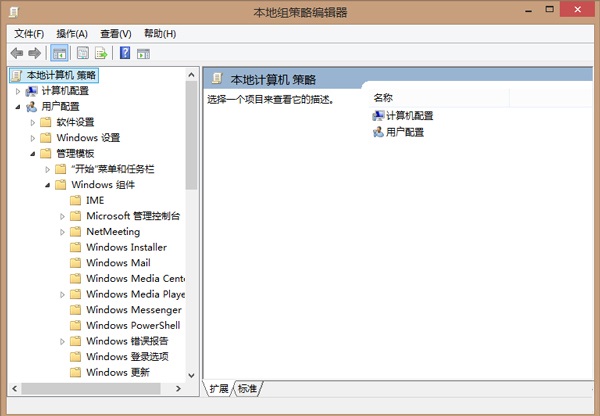 2、在Win8系统本地组上,展开“计算机配置”-“管理模板”-“Windows组件”;