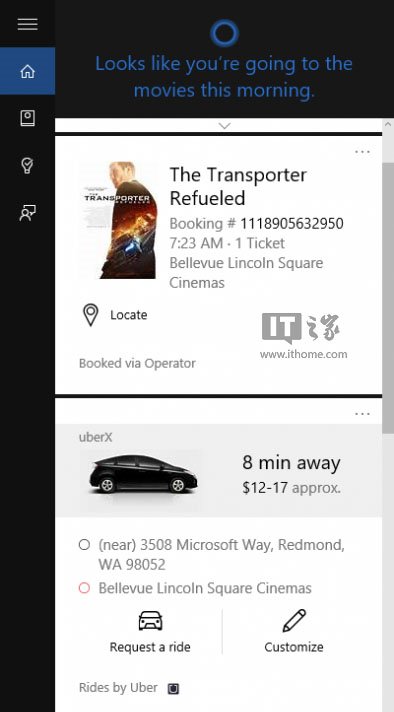 Cortana还增加了电影预订和重要事件提醒功能,通过确认电子邮件进行识别。在事件发生两小时之前,你会得到与之相关的更多帮助信息,比如,Cortana能够帮你通过Uber叫车。