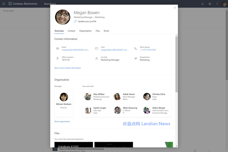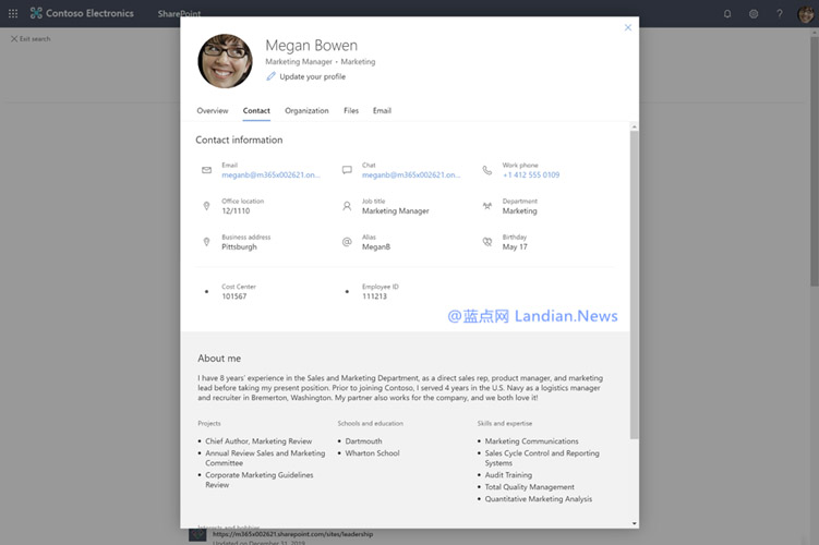 在微软官方博客中微软介绍即将带来的全新资料卡,这种资料卡最大的特点就是允许企业完全自定义员工资料卡。例如管理员可以配置诸如员工编号字段、办公室所在地、联系方式、生日甚至是部门主管以及部门其他联系人等。企业可以根据自己的需要对这类资料卡进行配置,这样在发送邮件后接收方只需鼠标悬停在头像上即可查看资料。