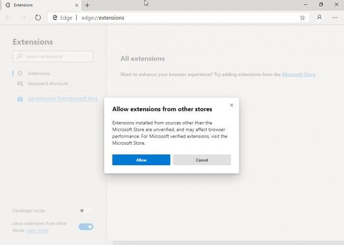 不过现在这条警告已经被移除。现在通过Edge浏览器访问Chrome Web Store,你会收到一条:“你可以将来自于Chrome Web Store的扩展程序安装到Microsoft Edge,请点击‘Add to Chrome’。”