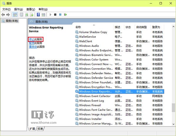 4、再找到Windows Error Reporting Service服务,同样点击“停止此服务”,如下图所示——