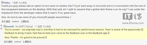 不过由于用户比较喜欢这个效果,恢复Windows10任务栏Aero特效的提议在《反馈》应用中得到了较多的赞成票,因此微软正考虑将这个功能请回。微软一位来自Windows Shell团队的员工在Reddit论坛上表达了上述观点。不过他还强调,这个想法还没有最终决定,如果要让Aero回归任务栏变成现实,还需要更多用户支持。