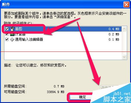 在控制面板里面有一个添加删除程序的选项,添加windows组件选择附件和工具选项, 点右下角详细信息,跳出的对话框选附件,之后就有画图了,安装就可以了,详细步骤如下: