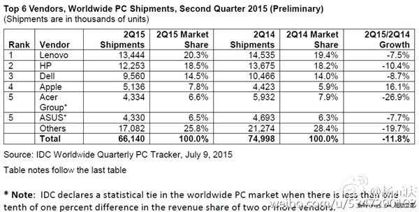 根据IDC的统计,2015年第二季度全球PC市场出货量同比下滑11%,跌至6610万台。而联想、惠普、戴尔、苹果、宏碁位列全球PC出货量的前五名,华硕仅仅名列第六。