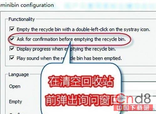 如果你觉得双击左键清空回收站太不安全,我们也可以进入MiniBin的设置中,设定在清除回收站时是否出现确认清除的窗口提示。怎么设置呢?右键单击托盘图标,选择“Configure”,并勾选其中的“Ask for confirmation before emptying the recyde bin”复选框最新xp系统下载。
