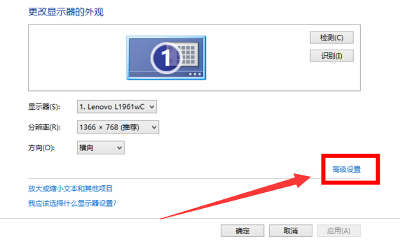 2.在屏幕分辨率设置窗口中,点击打开“高级设置”按钮。如下图所示