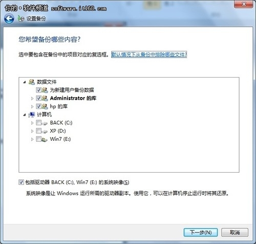 在Windows7系统中,用户可以选择要备份的内容,如文件夹、库甚至驱动器,系统都可根据选择的任意计划进行备份防患于未然。若用的是Windows7专业版或旗舰版,用户还可以选择将文件备份到网络上。