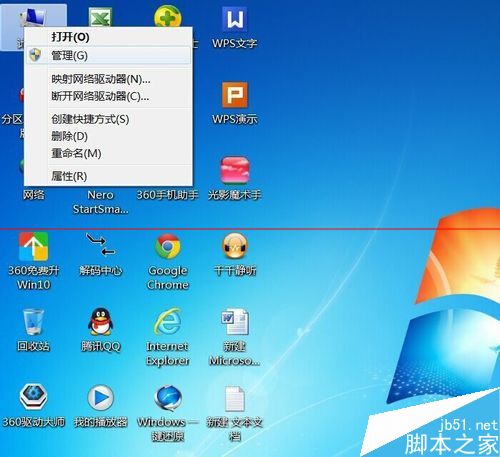 1、在桌面图标“计算机”上单击右键,选择“管理”。