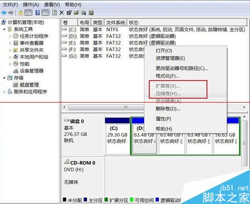 4、根据我的情况,D盘可以分出20G的空间,可以压缩D盘。在D盘上单击右键,可以看到我的“扩展卷”和“压缩卷”都是灰色的,表明不可用,可能我的C盘和D盘的文件系统不一样,C盘是NTFS,D盘是FAT32。如果你的可用,介绍一下将D盘的一部分分区转移到C盘的方法。首先,一定是和系统盘C盘相邻的一个盘,只能是D盘,如果你的D盘装文件的过多,最好先转移到其他盘。然后,右键单击D盘选择“压缩卷”,填入要压缩的数值,换算成M,20G就是20*1024M=20480M。压缩过后,硬盘会多出一个未分配卷,右键单击C盘选择“扩展卷”,将未分配卷扩展到C盘即可。