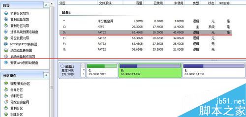 2、运行分区助手5.6,点击D盘,这里可以看到,D盘已使用空间18.39G,未使用45.09G,分出来20G的空间绰绰有余。