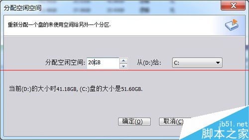 4、在“分配空闲空间”对话框中输入分配出去的空闲空间大小,输入20G,从(D:)分给C盘。这里说明一下,分区助手可以自由选择分配的目标盘,不必须是相邻的盘,同样可以是E盘和G盘,因为我们要扩展C盘,这里就选C:。输入完后“确定”。