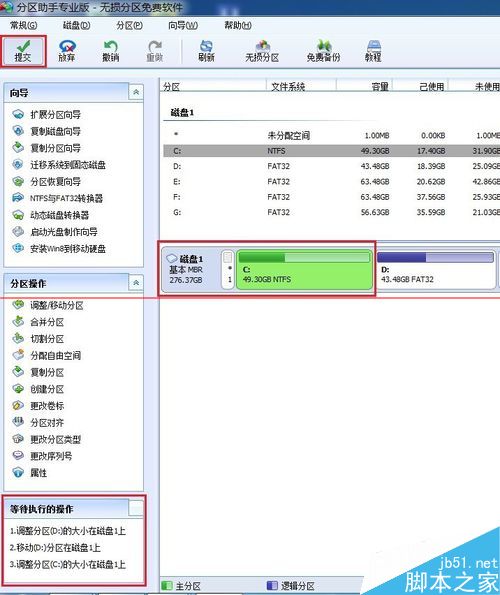 5、设定完成后,又回到主界面,可以看到C盘显示的空间变成49.30G,这并不是表示分区调整已经完成,这只是调整后结果的一个预览。界面左边下面显示了“等待执行的操作”,包括“调整分区D的大小”、“移动D分区”、“调整分区C”。接着点击界面左上角的“提交”就可以执行操作了。