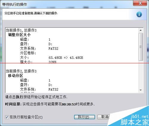 6、再次弹出“等待执行的操作”对话框确认,勾选“在执行前检查分区”,确认后点击“执行”。硬盘分区调整比较慢,需要耐心等待,我的扩展C盘空间执行了半个小时。