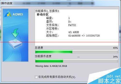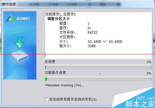 7、软件显示“操作进度”,先是扫描文件系统,然后移动数据。
