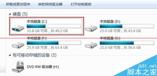9、下面在“计算机”中双击确认一下,同样可以看到,C盘系统盘31.8G可用,共49.2G,系统的计算和软件的计算存在一些出入。