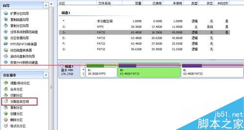 3、在软件界面左边“分区操作”区点击“分配自由空间”,弹出“分配空闲空间”对话框。