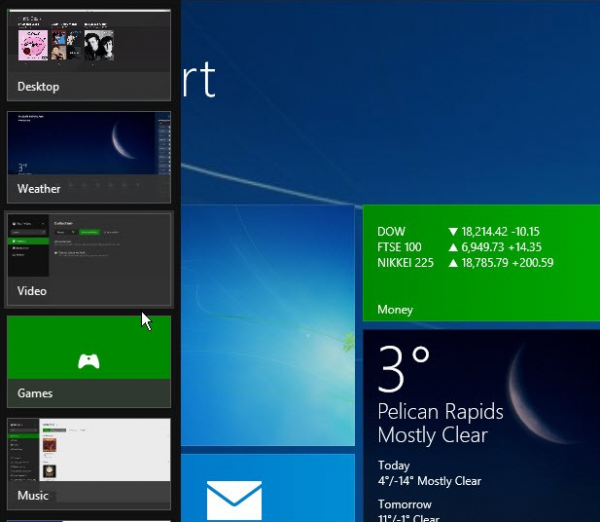 虽然当初微软并没有强调这个Windows 8中的新功能,但它仍然是专为触摸设备而设计的。桌面用户几乎不会使用这个功能,并且由于是基于屏幕边角为基础的导航,鼠标和键盘操作起来并不方便。