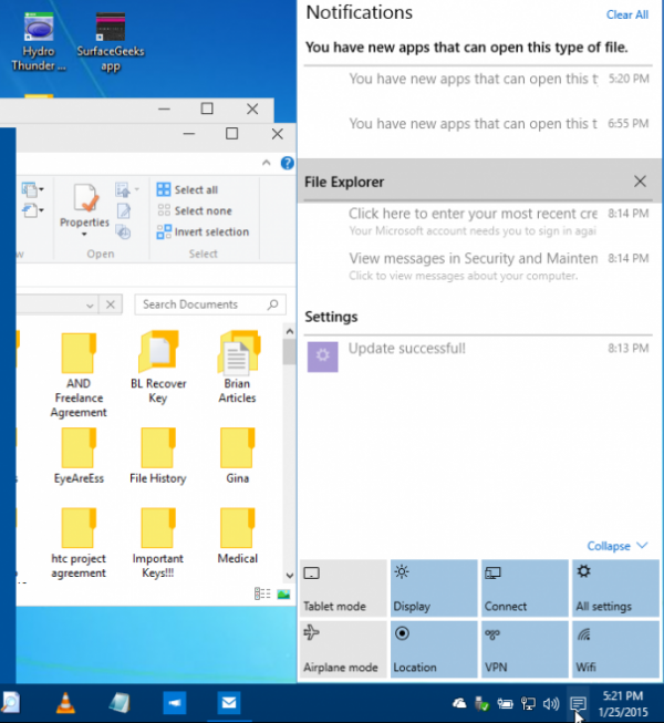 Action Center成为了微软新宠儿,它为用户提供了从应用程序,近期电子邮件和系统的通知,同时也让用户快速进行系统设定,如Wi-Fi、显示设置和平板模式切换。如果你使用的是触控设备,那么从右边滑动手指就能呼出菜单。如果没有,也能单击位于任务栏的图标呼出。