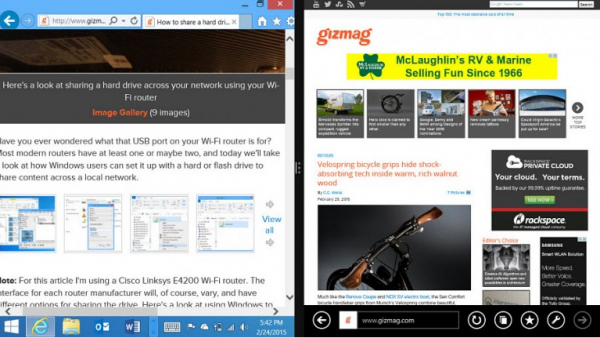 默认情况下,在Windows 8中,Modern应用就以全屏幕显示,用户没有办法来调整应用程序的窗口大小。但现在所有的Modern应用程序都可以调整大小,并可以在传统桌面环境下运行,这缓解了两个环境之间的问题。