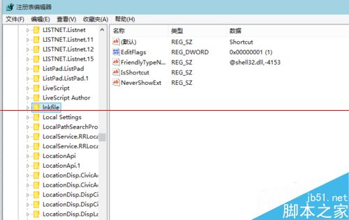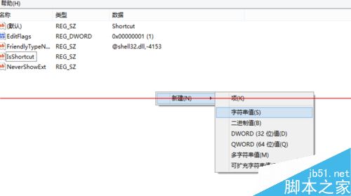 5、再在注册表编辑器右侧找到“IsShortcut”字符串值项,然后右键单击将其删除。