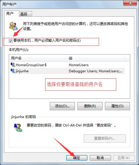如下图所示,打开用户账户对话框后,将“要使用本机,用户必须输入用户名和密码”前面的勾去掉,最后点击“确定”按钮保存设置。