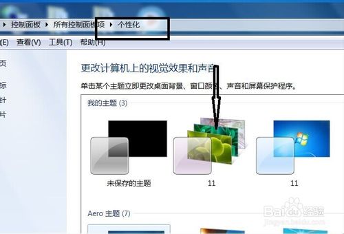 (2)第二步:单击“个性化”,进入个性化设置这个面板,而下面的主题均是win7系统自带的桌面背景主题。