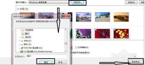 第三步:进入“桌面背景面板”,点击浏览,弹出一个窗口,找到演示(小编演示的在D盘的名字为图片的文件夹里)存放图片的路径,点击确定,最后保存修改,就可以把自己喜欢的图片设置成电脑桌面背景了。
