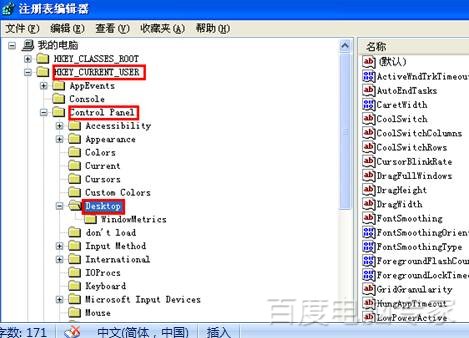 3、在注册表编辑器页面展开到“HKEY_CURRENT_USER/Control panel/Desktop”:
