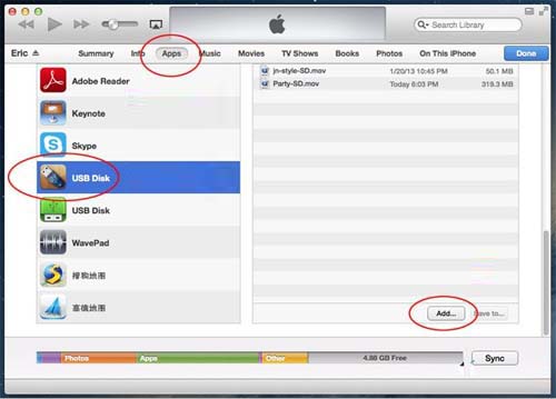 三、点击“Apps”,然后在下面找到你的USB Disk应用,点击你的USB Disk应用那个图标,在右侧就显示U盘里面的内容,点击右下脚的"Add",你就可以在电脑硬盘里面寻找并添加文件。