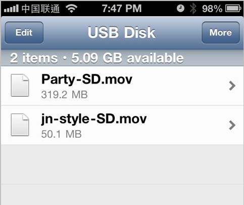 四、打开你iPhone上的USB Disk应用,现在你就可以看见你的文件了,视频和图片可以直接点击播放。