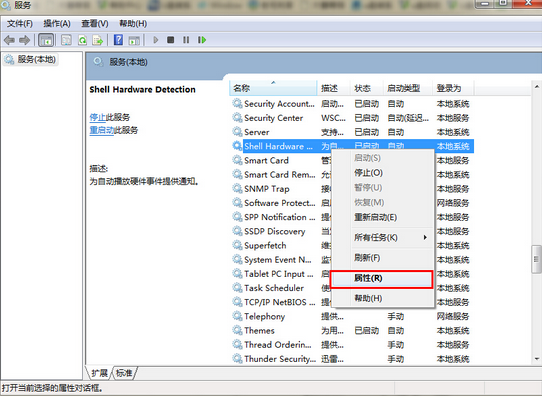 重新开启shell hardware detection服务,点击“开始”在搜索框中输入“services.msc”后按回车键。接着找到“shell hardware detection”点击右键服务进入“属性”。如下图所示: