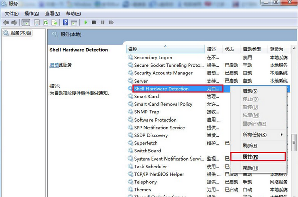 2、在打开的服务窗口中,找到“shell hardware detection”服务,然后单击右键,在弹出的选项窗口中点击“属性”,如下图所示: