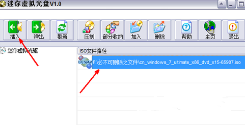 4、然后回到软件界面中,就可以看到这个镜像文件已经被加载到软件中了,之后点击左上角的“插入”按钮,开始模拟光驱加载;