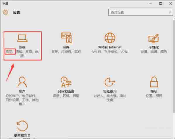 2。单击下拉菜单中的[设置]选项,进入Win10安装对话框窗口,然后在设置选项中找到[系统]功能选项。该选项下有一个[Display]功能按钮;如图所示: